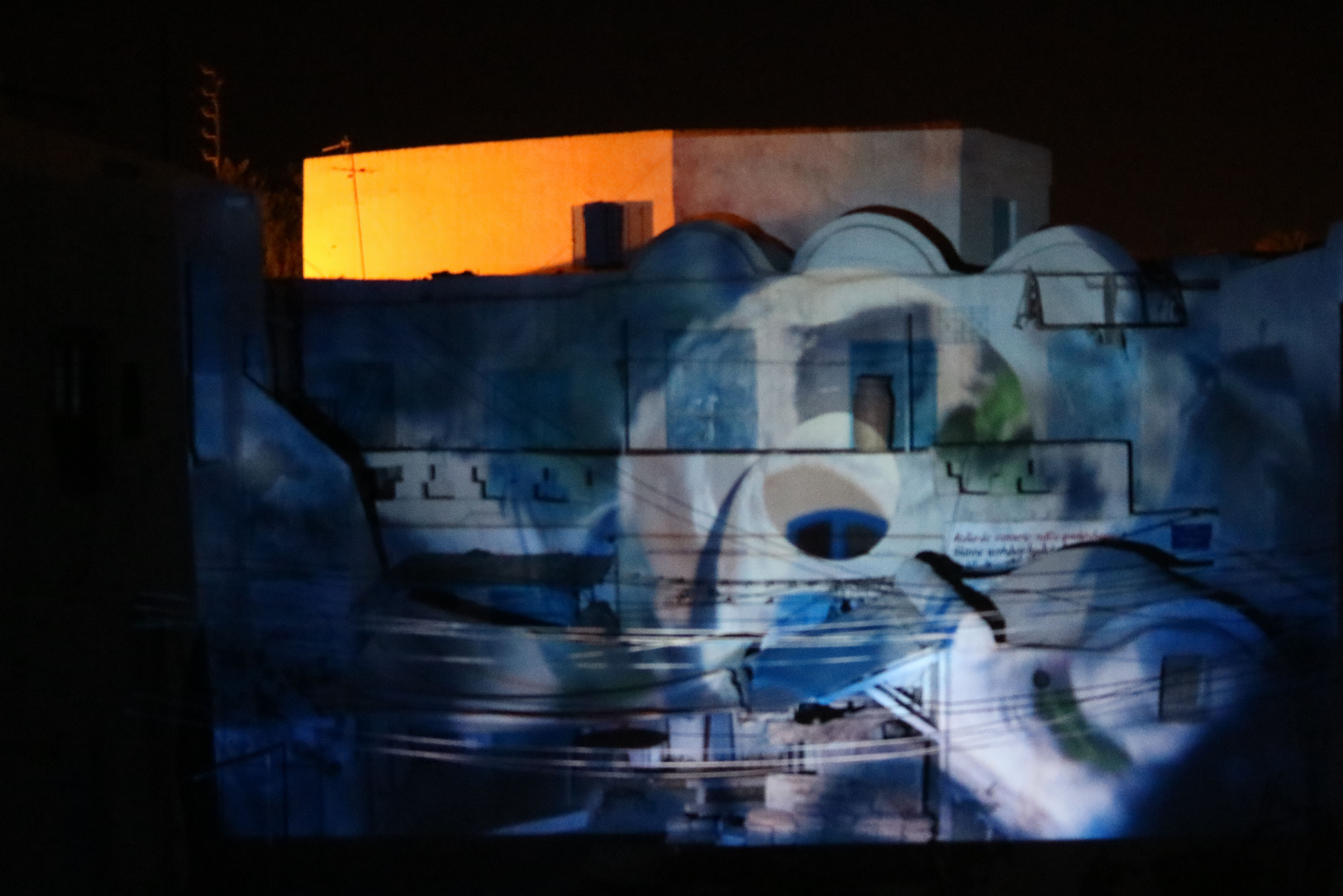 Martina Stella: “While conceiving the projection “L’espace du dedans” I was searching for some precise spatial and temporal conditions, I wanted to create a situation of nothingness, a suspended and contemplative atmosphere. The title of the projection itself recalls the architecture of the site, Fondouk Lehsayer, which is a closed space in the open air, one of the few private fondouk of Djerba. During the daytime, Fondouk Lehsayer is a place of passage, a hallway between two streets: the projection invites people to gather and to stay for a while. L’espace du dedans means the inner space, as an inner place in the city, but also the interior dimension of somebody, as the distorted camera view wandering around Djerba’s details tries to suggest.